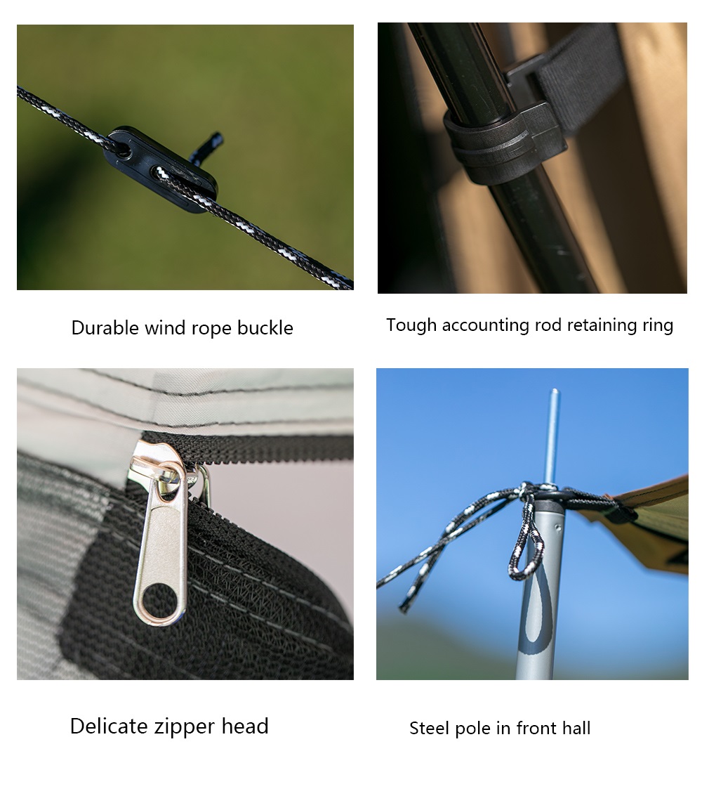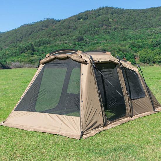 Two rooms and one living room Tent Set up size: Large size: 430 x 305 x 200cm Small size: 310 x 220 x 190cm Weight: Large size 16.8kg / Small size 10kg Fabric: 150Dpu Oxford fabric+high-density mesh Bottom tent: 6000MM water pressure thickened wear-resistant PE External tent: 150Dpu Oxford cloth Frame pole: painted steel pipe+fiber pole Packaging size: 68 x 32 x 32cm Color: khaki / light khaki More