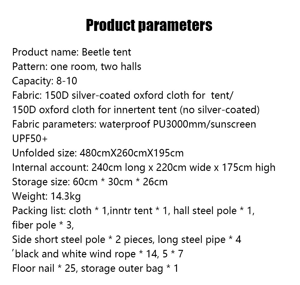 Rhinoceros Tent Fabric performance Waterproof: PU3000mm Sunscreen power: UPF50+ Fabric:150D Oxford cloth B4 mesh Storage size: 120cm*25cm*25cm Set up size: 455x275x205cm Inner tent: 270x270x195cm Weight:11.6kg More