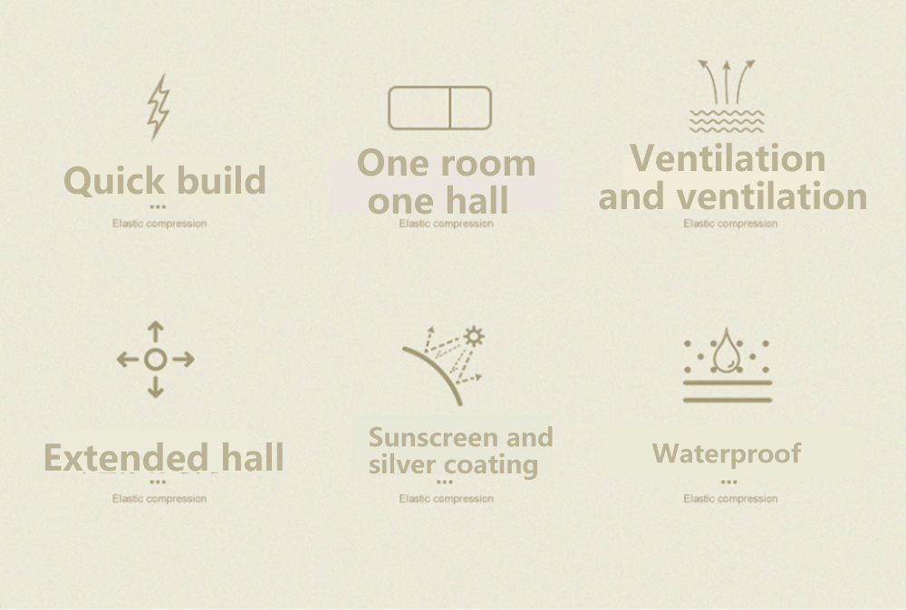 Two rooms and one living room Tent Set up size: Large size: 430 x 305 x 200cm Small size: 310 x 220 x 190cm Weight: Large size 16.8kg / Small size 10kg Fabric: 150Dpu Oxford fabric+high-density mesh Bottom tent: 6000MM water pressure thickened wear-resistant PE External tent: 150Dpu Oxford cloth Frame pole: painted steel pipe+fiber pole Packaging size: 68 x 32 x 32cm Color: khaki / light khaki More