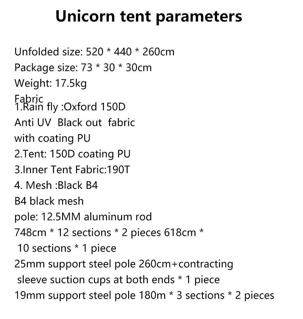 Rhinoceros Tent Fabric performance Waterproof: PU3000mm Sunscreen power: UPF50+ Fabric:150D Oxford cloth B4 mesh Storage size: 120cm*25cm*25cm Set up size: 455x275x205cm Inner tent: 270x270x195cm Weight:11.6kg More
