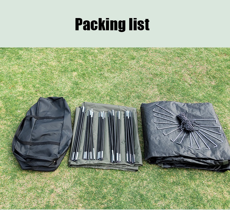Car rear Tent Fabric performance Waterproof:PU3000mm Sunscreen power:UPF50+ Fabric:210T Checkered polyester,High density hexagonal mesh Storage size: 45x20x15cm Set up size: 300x200x200cm Weight:2.7kg More