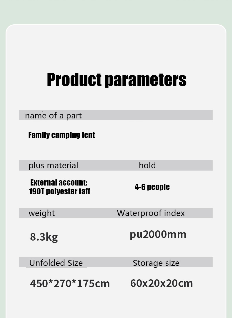 Rhinoceros Tent Fabric performance Waterproof: PU3000mm Sunscreen power: UPF50+ Fabric:150D Oxford cloth B4 mesh Storage size: 120cm*25cm*25cm Set up size: 455x275x205cm Inner tent: 270x270x195cm Weight:11.6kg More