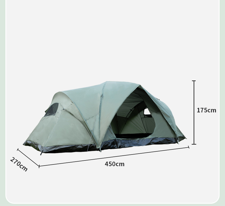 Two rooms and one living room Tent Set up size: Large size: 430 x 305 x 200cm Small size: 310 x 220 x 190cm Weight: Large size 16.8kg / Small size 10kg Fabric: 150Dpu Oxford fabric+high-density mesh Bottom tent: 6000MM water pressure thickened wear-resistant PE External tent: 150Dpu Oxford cloth Frame pole: painted steel pipe+fiber pole Packaging size: 68 x 32 x 32cm Color: khaki / light khaki More