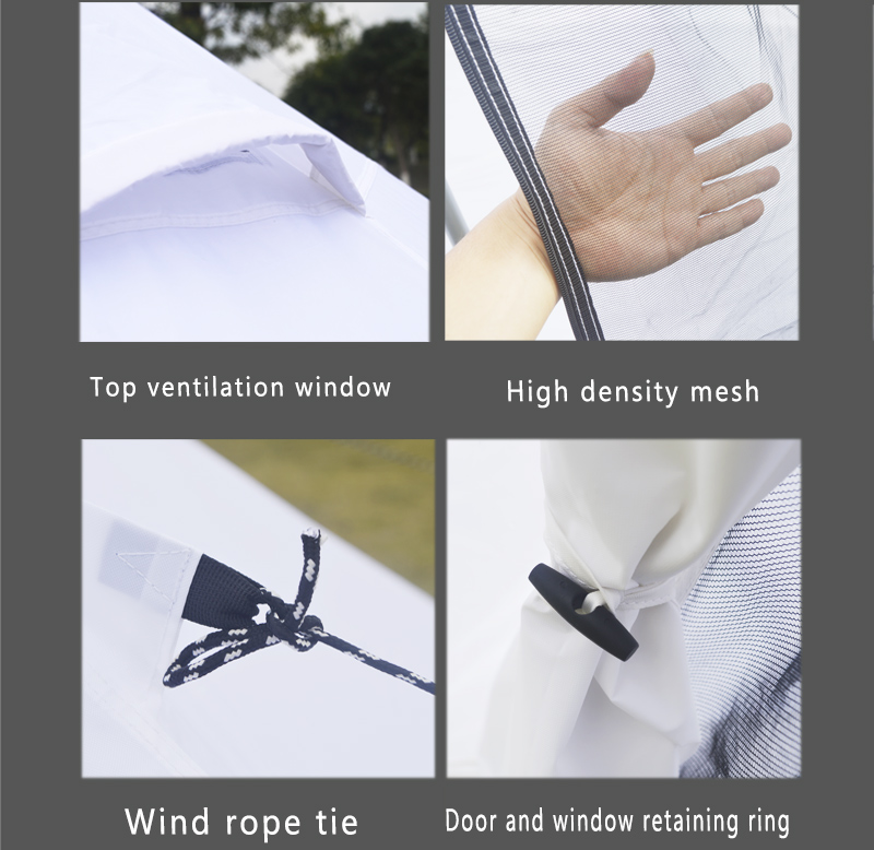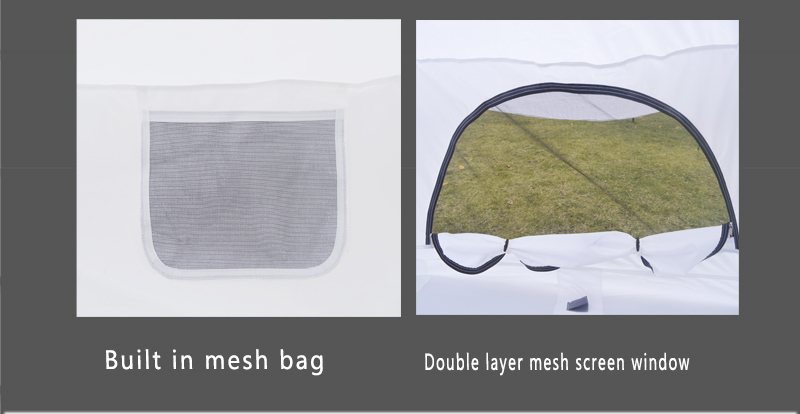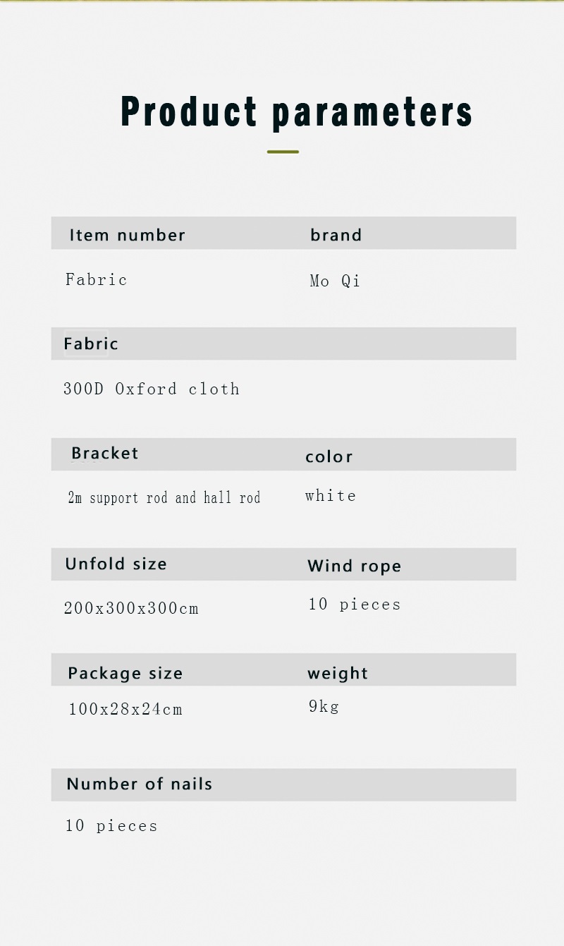 Canopy House Fabric:150D/PU Waterproof:3000MM Set up size:385*350*225CM Storage size:66*18*18cm Pole:16MM Iron tube, 150CM*4 strip Other accessories:5*7 Ground nail*6 Fabric:P/T 68D/PU Waterproof:600MM Set up size:300*220*170CM Other accessories: wind rope 3.5MM Black and white wind rope 300CM*6, 5*7Ground nail*8 More