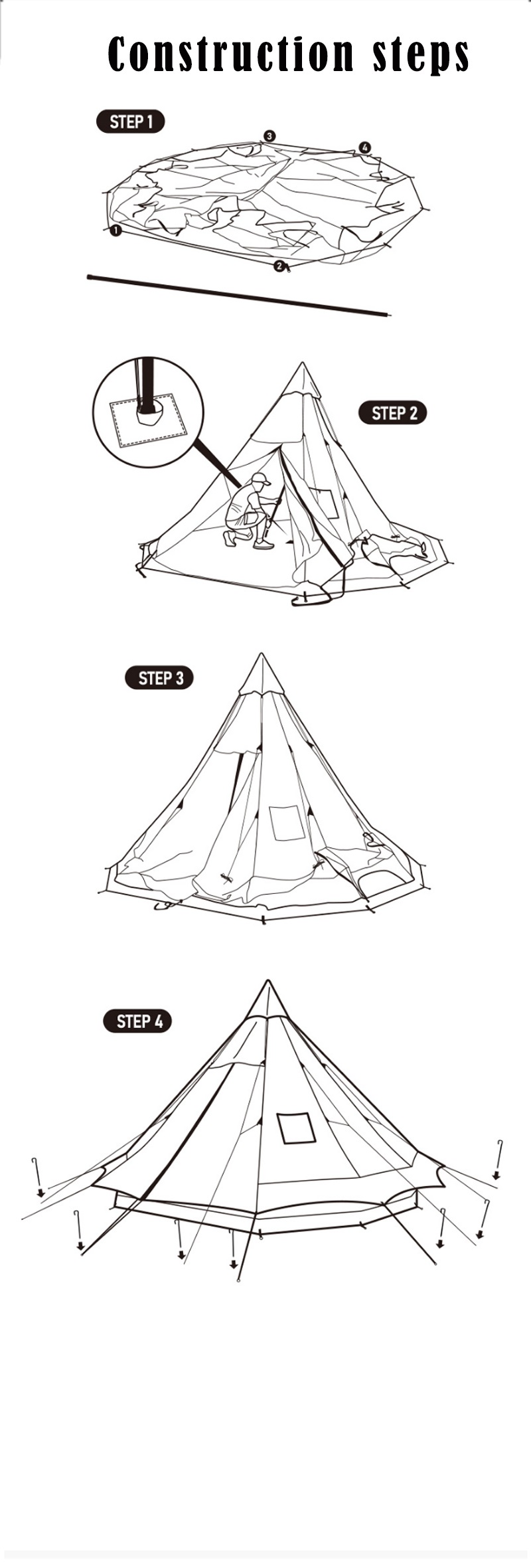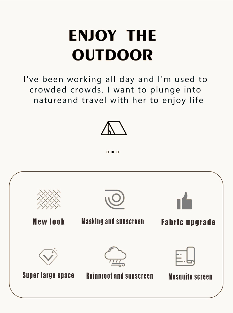 Two rooms and one living room Tent Set up size: Large size: 430 x 305 x 200cm Small size: 310 x 220 x 190cm Weight: Large size 16.8kg / Small size 10kg Fabric: 150Dpu Oxford fabric+high-density mesh Bottom tent: 6000MM water pressure thickened wear-resistant PE External tent: 150Dpu Oxford cloth Frame pole: painted steel pipe+fiber pole Packaging size: 68 x 32 x 32cm Color: khaki / light khaki More